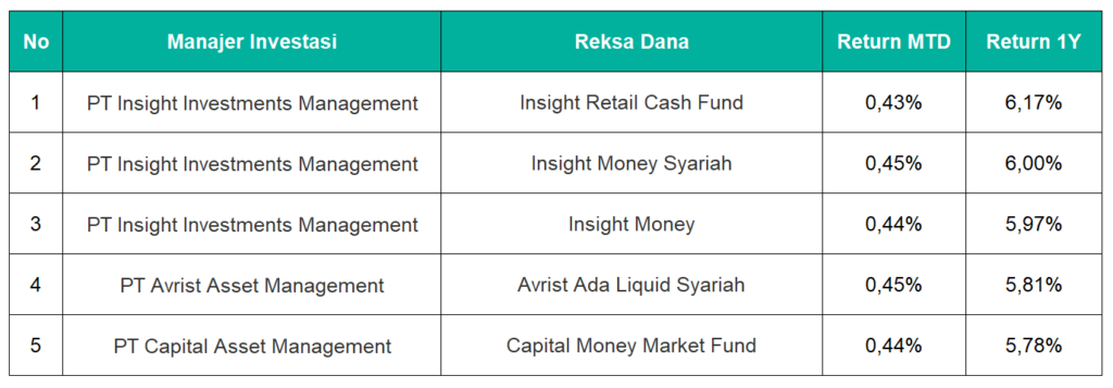 Lima reksa dana dengan kinerja terbaik yakni Insight Retail Cash Fund,Insight Money Syariah,Insight Money, Avrist Ada Liquid Syariah, dan Capital Money Market Fund.