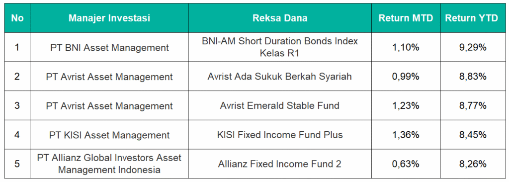 Lima reksa dana dengan kinerja terbaik yakni BNI-AM Short Duration Bonds Index Kelas R1, Avrist Ada Sukuk Berkah Syariah, Avrist Emerald Stable Fund, KISI Fixed Income Fund Plus, dan Allianz Fixed Income Fund 2.