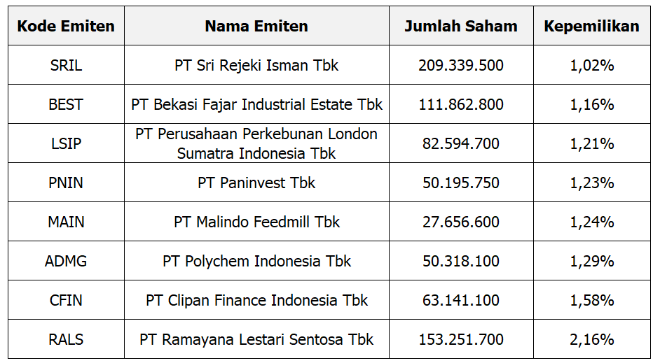 Laporan tersebut memberikan informasi mengenai pihak-pihak yang memiliki saham di atas 1% pada suatu perusahaan. Bahkan, Anda bisa melihat beberapa nama tokoh pasar modal di Indonesia seperti Lo Kheng Hong (LKH) dan Andry Hakim. Berdasarkan data per 27 Februari 2026, berikut merupakan beberapa saham yang dimiliki oleh Lo Kheng Hong: