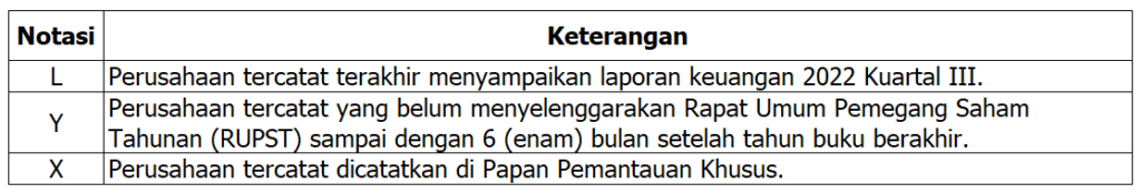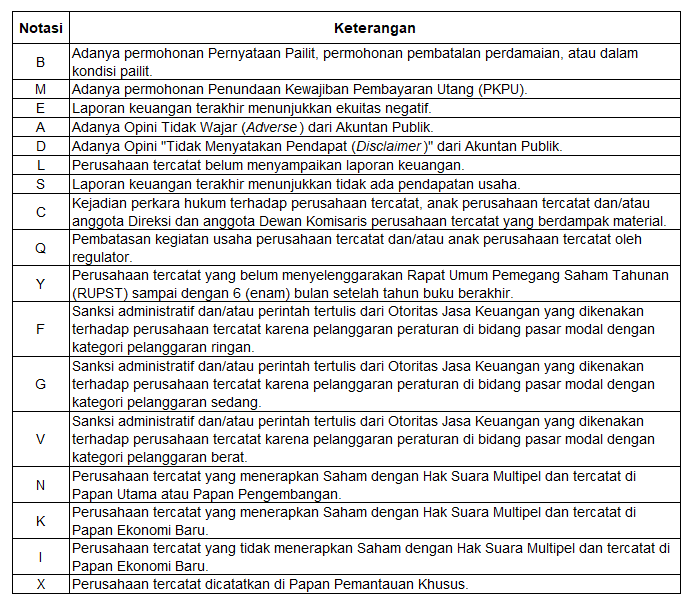 Merujuk pada Surat Edaran Direksi PT Bursa Efek Indonesia Nomor SE-00017/BEI/07-2021 Tahun 2021 tentang Penambahan Tampilan Informasi Notasi Khusus pada Kode Perusahaan Tercatat, terdapat 17 notasi khusus saham yang dikeluarkan oleh BEI untuk menandai emiten dengan kondisi tertentu.