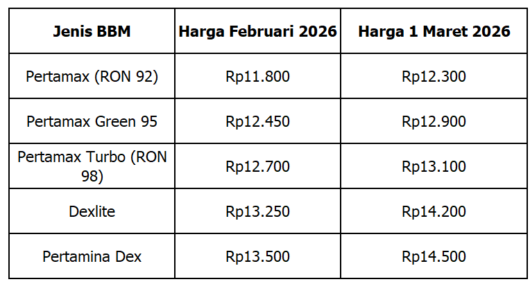Seiring tren kenaikan harga minyak global di tengah eskalasi konflik, Pertamina melakukan penyesuaian harga BBM non-subsidi yang mulai berlaku pada 1 Maret 2026.