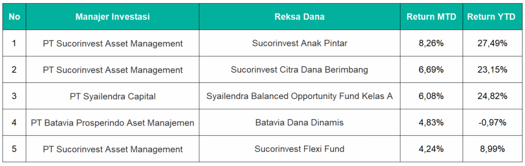 Lima reksa dana campuran dengan kinerja terbaik yakni Sucorinvest Anak Pintar, Sucorinvest Citra Dana Berimbang, Syailendra Balanced Opportunity Fund Kelas A, Batavia Dana Dinamis, dan Sucorinvest Flexi Fund.