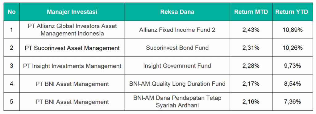 Lima reksa dana dengan kinerja terbaik yakni Allianz Fixed Income Fund 2, Sucorinvest Bond Fund, Insight Government Fund, BNI-AM Quality Long Duration Fund, dan BNI-AM Dana Pendapatan Tetap Syariah Ardhani.