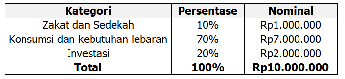 Sebelum memutuskan untuk mengalokasikan dana THR ke dalam produk reksa dana, penting untuk mengetahui alokasi dana secara keseluruhan. Misalnya, jika Anda menerima THR sebesar Rp10 juta, alokasikan terlebih dahulu untuk zakat dan kebutuhan lebaran. Sebagai contoh, Anda mengalokasikan 10% atau Rp1 juta untuk zakat, serta 70% atau Rp7 juta untuk kebutuhan lebaran. Di bawah ini merupakan contoh rincian alokasi THR tersebut dalam bentuk tabel.
