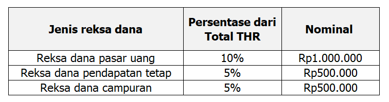 Setelah mengalokasikan kebutuhan tersebut, berarti THR Anda masih ada 20% atau sebesar Rp2 juta. Anda dapat menentukan persentase investasi reksa dana dari THR yang masih ada tersebut. Langkah selanjutnya adalah memilih jenis reksa dana yang sesuai dengan profil risiko dan tujuan keuangan Anda. Berikut ini adalah contoh pembagian alokasi jenis reksa dana yang dapat Anda pertimbangkan.