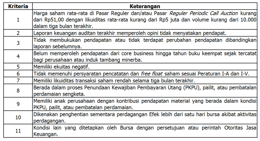 Papan Pemantauan Khusus dibentuk sebagai sarana pengawasan BEI terhadap saham yang dinilai memiliki kondisi tidak normal atau berisiko tinggi. Pencantuman suatu saham ke dalam papan ini didasarkan pada kriteria tertentu yang telah ditetapkan. Perusahaan dapat dikenakan kriteria tertentu apabila memenuhi satu atau lebih kondisi berikut: