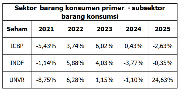 Tabel 2. Kinerja beberapa saham sektor barang konsumen primer 2021-2025