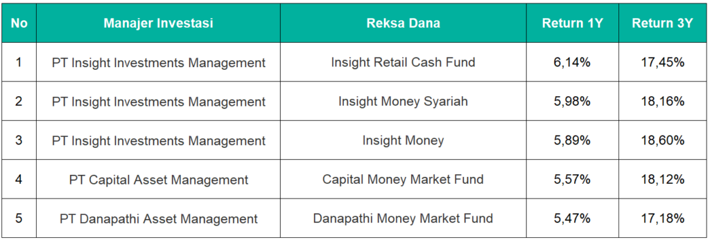 Lima reksa dana dengan kinerja terbaik yakni Insight Retail Cash Fund, Insight Money Syariah, Insight Money, Capital Money Market Fund, dan Danapathi Money Market Fund.