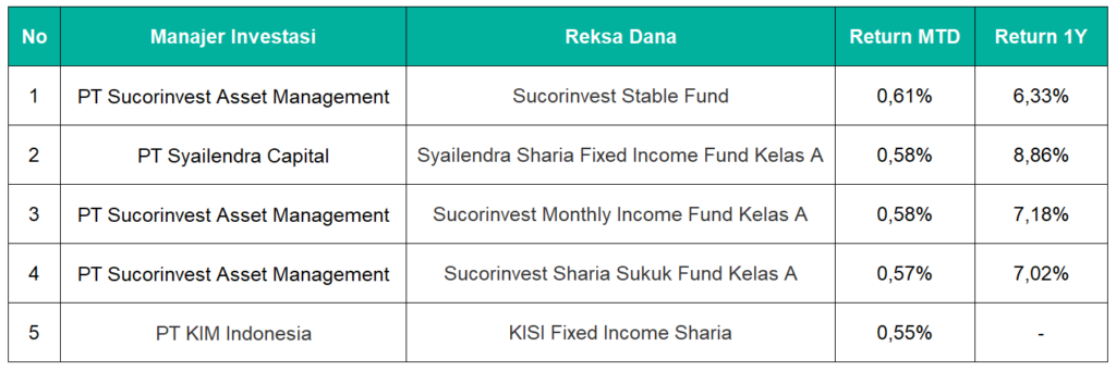Lima reksa dana dengan kinerja terbaik yakni Sucorinvest Stable Fund, Syailendra Sharia Fixed Income Fund Kelas A, Sucorinvest Monthly Income Fund Kelas A, Sucorinvest Sharia Sukuk Fund Kelas A, dan KISI Fixed Income Sharia.